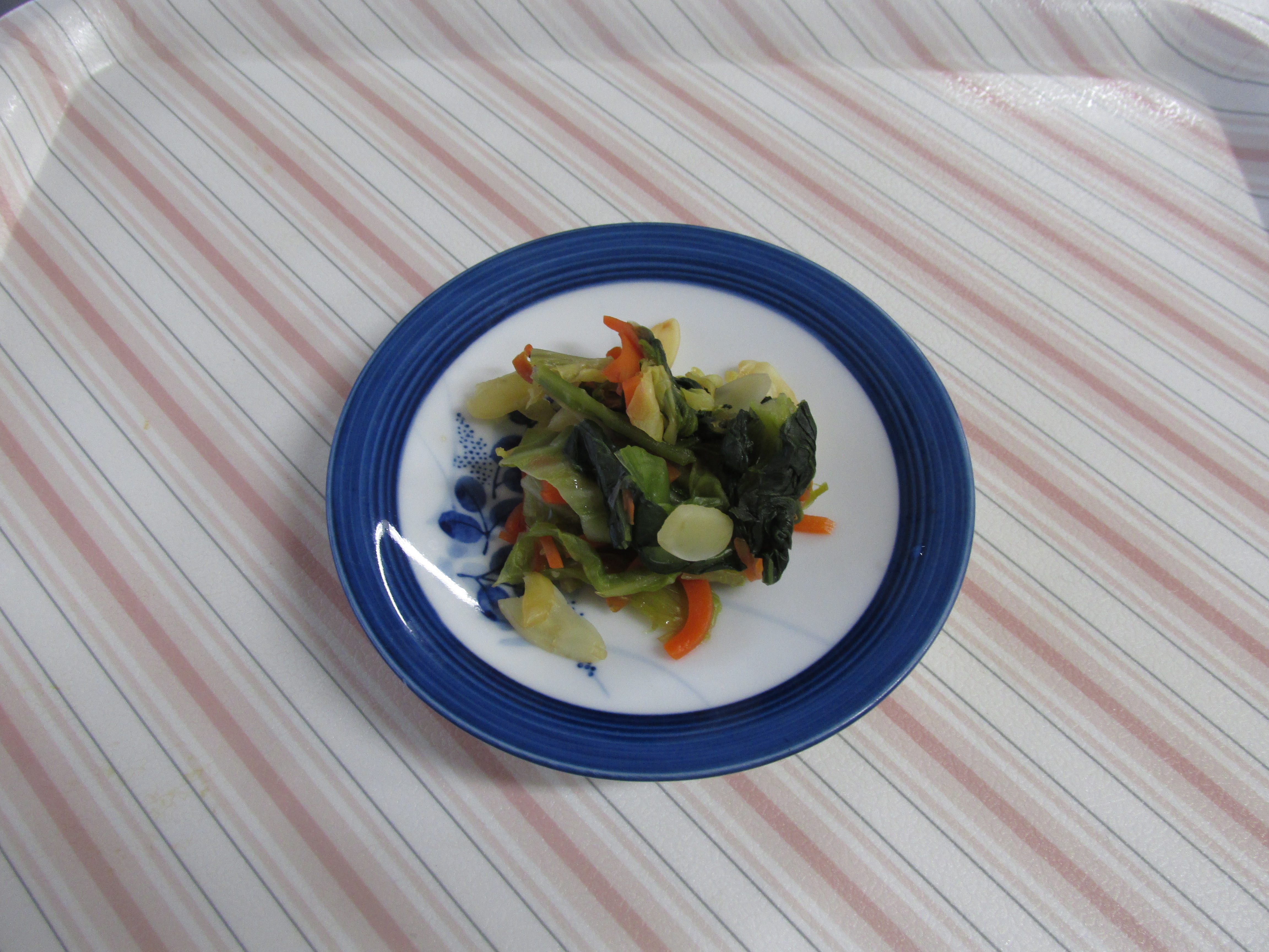①キャベツ、小松菜はざく切り。人参は千切りにする。