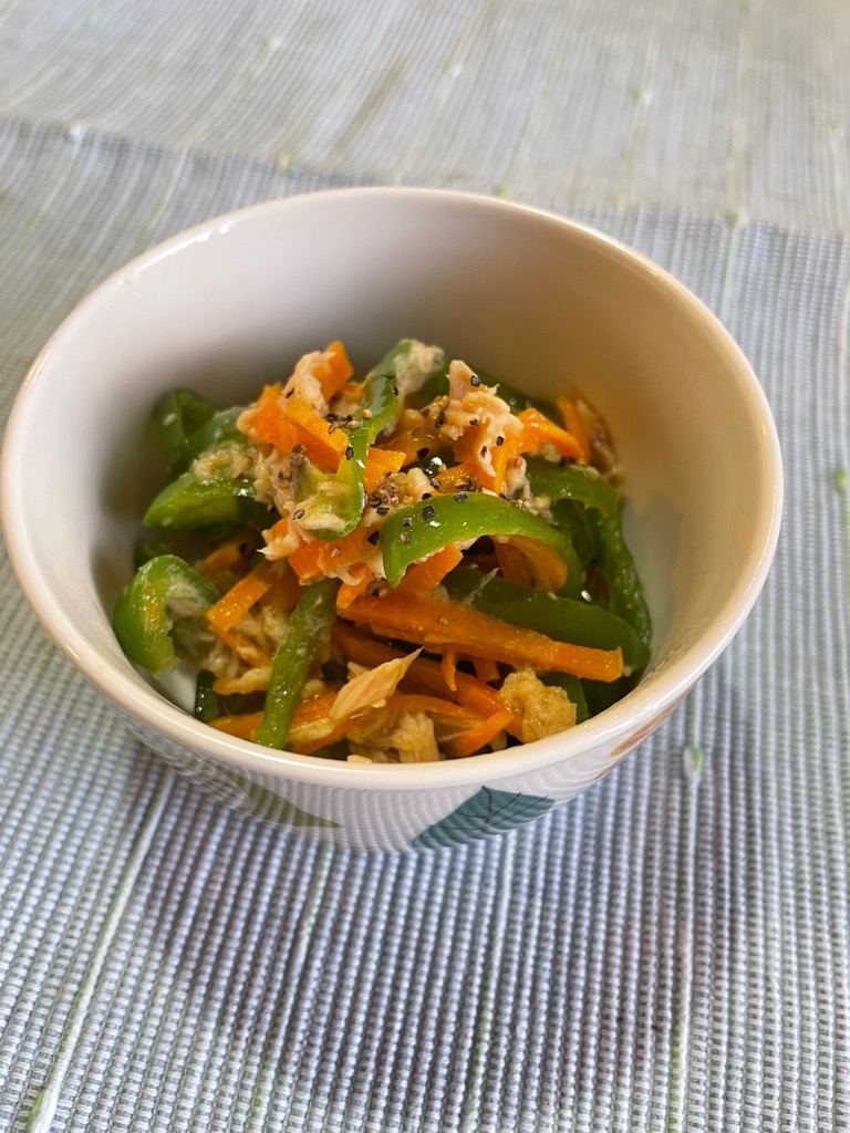 ➀ ピーマンは5㎜幅の細切りにし、人参は千切りにする。ツナは油をきる。